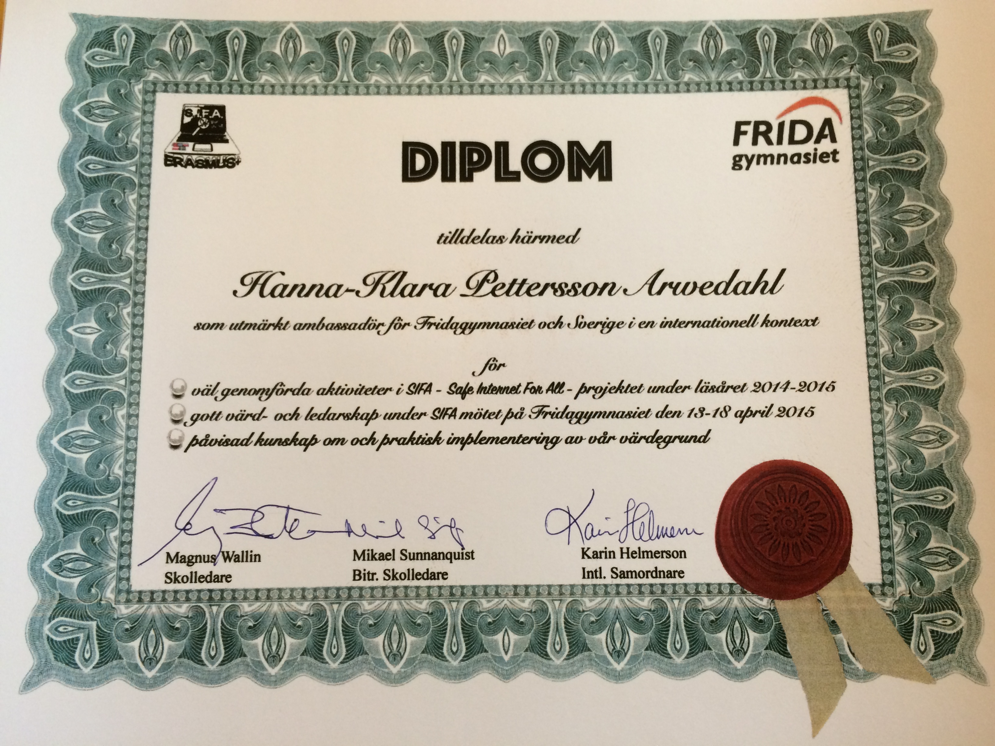 SIFA celebrations and Certificate awards to students were carried out at the Fridagymnasiet on the 8th and 9th of June 2015. There were evaluations of the SIFA project year as well as brain storm workshops to collect good ideas from the students about a good kick-off activity for the project in the autumn.